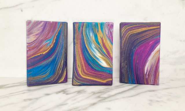 Peppermint Sky opens with a cool rush of peppermint and rosemary - fresh, bold, and invigorating. Lemon, lemongrass, and grapefruit follow, adding brightness and lift with citrus clarity and green vibrance. Swirled in hues of violet, blues, greens, gold, and pink, the soap evokes movement, freshness, and a sense of renewal.