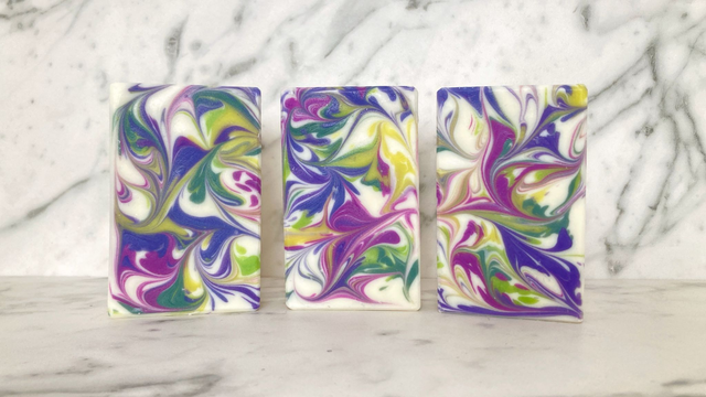 A serene soap with soft swirls of purples, greens, and white. This bar brings spa-like calm with soothing lavender, lifted by sweet orange, lemon, and bergamot. Its scent is fresh like crisp linen, with cedarwood adding warmth - a tranquil touch.
