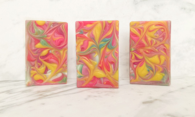 A romantic bloom in warm light. Swirled in soft reds, pinks, greens, yellows, and white, this bar evokes the richness of summer florals. Scented with Eastern Velvet, it blends opulent rose with hints of praline and oud wood for a deep, complex aroma. Sweet, floral, and quietly luxurious - this is a soap for slow, golden evenings.